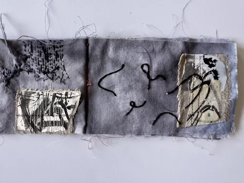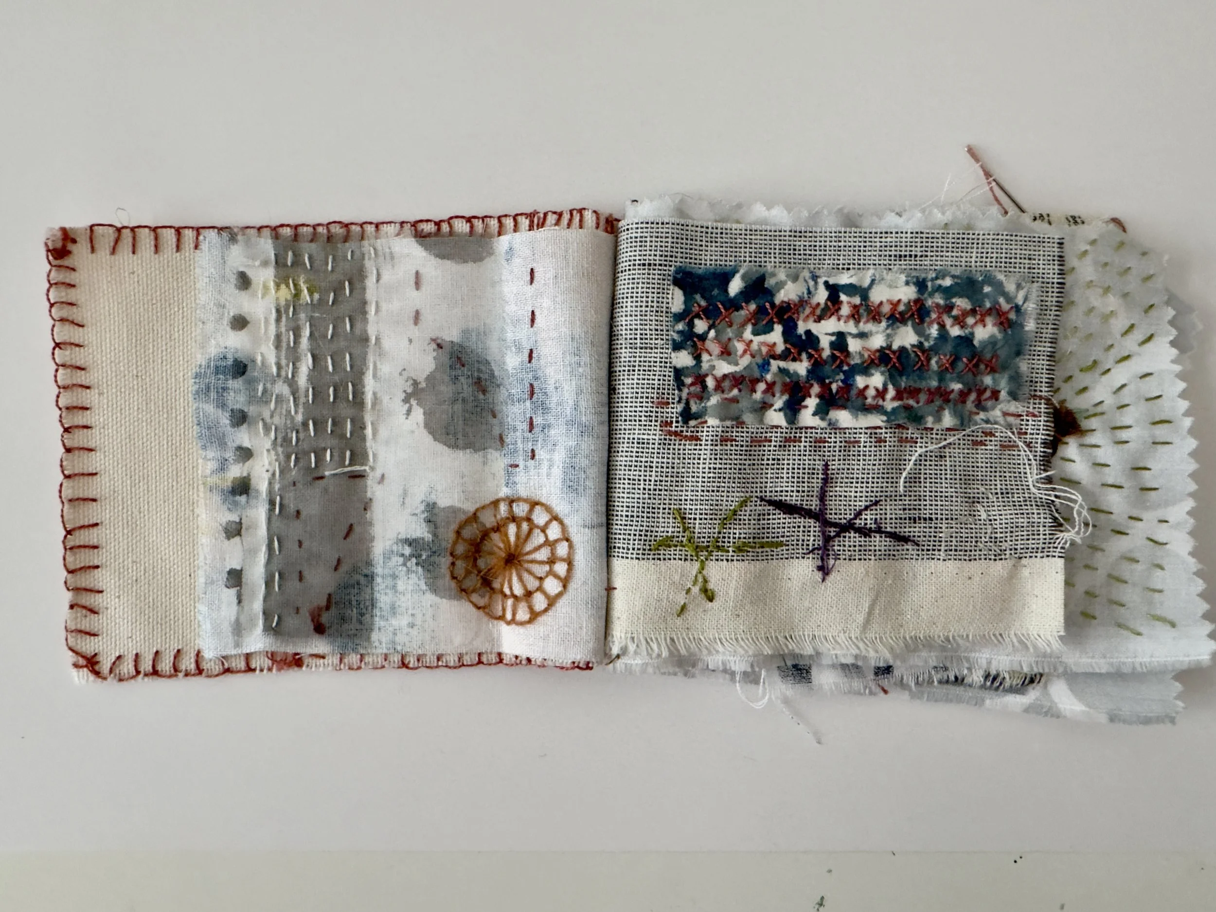 After my little banner hung in the elements all winter in 2023, I took it apart and added other found elements. These then continued to commune with each other and the elements, hanging from the crabapple tree outside my studio window. Among the components I incorporated were fabrics dyed with plants from the yard, embroidered and printed images of plants (again, from my yard), scraps of thread and vintage fabric. I have gone on to add more experimental elements, such as watercolor paper with marks from a handmade-feather brush. After being in the elements for so many months, there are new patterns and colors- constellations of mildew, uneven faded dyes, and dirt, along with all the unseen microbes and molecules present in the environment that are now woven into these fragments.