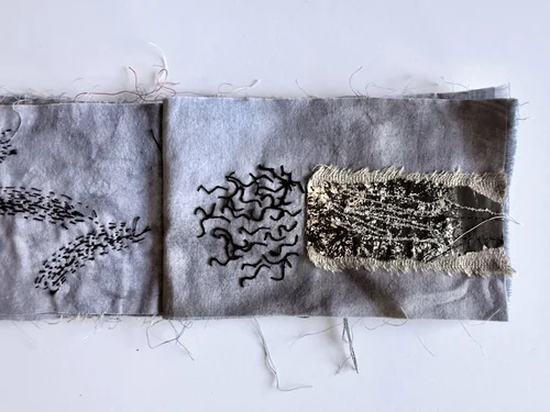 Echoing the tradition of Tibetan prayer flags, I stitched this banner to hang outside in my own yard in Bowie, Maryland, where I am nurturing a wildlife-friendly, native ecosystem. This gesture began as a way of offering prayers for healing this land, which has been scarred by centuries of exploitation, colonialism, and environmental degradation. This project has evolved into a cyclical, open-ended practice.